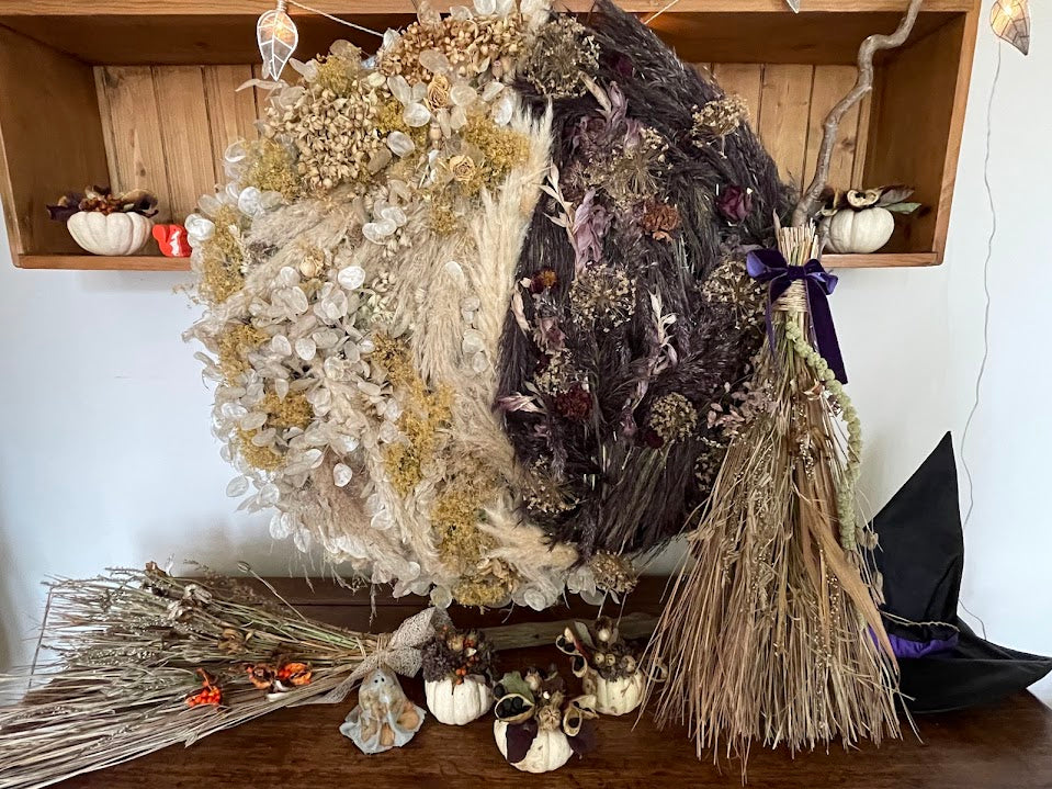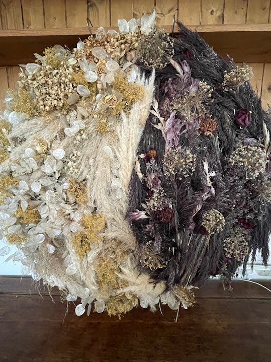 This 90cm x 90cm Moonscape art piece features a captivating blend of contrasting dark and light grasses, radiant lunaria, rich purple astrantia and an array of other dried flowers that have been locally foraged or grown in my own small garden.